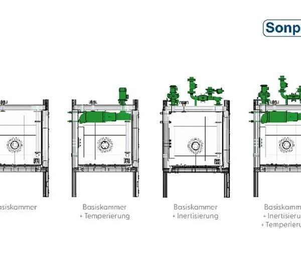 基础试验箱可根据需求提供带隔热或不带隔热的版本,也可以作为纯粹的防护外壳使用。同时,温控系统和惰性化系统均可随时扩展升级。Sonplas 提供的恒温试验箱既可以作为集成在整机中的解决方案,也可以作为具有成本优势的独立版本使用。“我们的一些客户并不需要一开始就投资昂贵的定制化设备,而是更希望先获得一个具备惰性化和温控能力的防护外壳。具体的测试装置通常由客户自行集成,”Sonplas 专家解释道。“正因为如此,我们将恒温试验箱设计为模块化结构。”